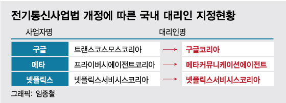 넷플릭스는 해외본사 대신 한국법인인 넷플릭스서비시스코리아를 부가통신사업자로 등록해 국내 대리인 지정 의무가 없다. 구글·메타도 이번에 대리인을 변경하면서 법 개정에 따른 조처가 완료된 셈이다.