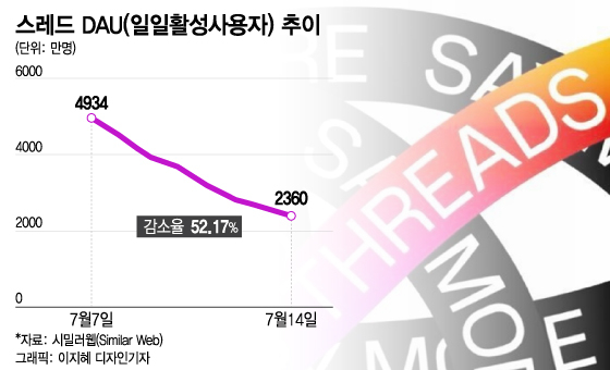 19일 웹 분석 전문 트래픽 통계 사이트 시밀러웹(Similar web)에 따르면 전 세계 스레드 DAU(일일활성사용자)는 지난 7일 4900만명에서 14일 2360만명으로 일주일 만에 절반이하로 떨어졌다. 글로벌 시장조사업체 센서타워(Sensor tower) 분석에서도 출시 일주일차인 지난 12일 DAU가 지난 8일 대비 20% 감소했다.