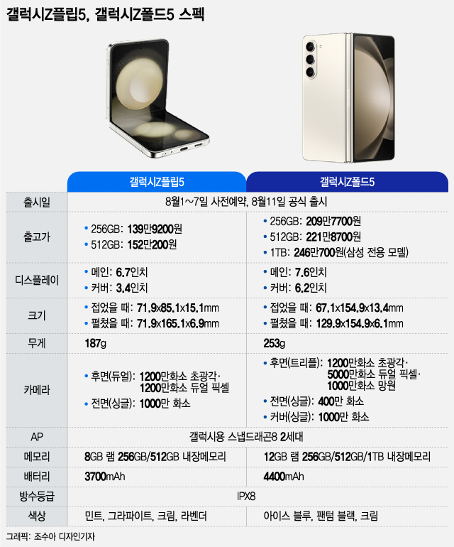 출고가는 부품값 인상 여파로 전작 대비 5만~10만원 올랐다. 플립5는 139만9200원부터, 폴드5는 209만7700원부터 시작한다. 최상위 모델인 폴드5의 1TB 모델은 250만원에 육박한다. 삼성은 내달 1일부터 7일까지 플립5·폴드5 사전예약을 진행하고, 같은 달 11일 공식 출시한다.
