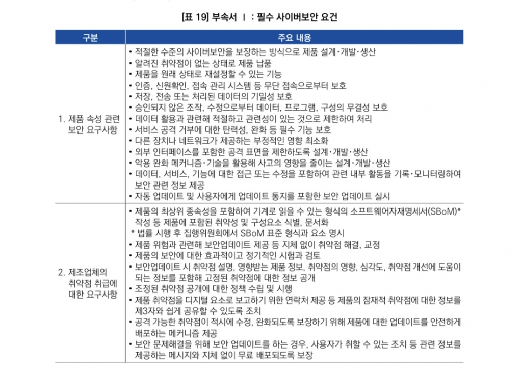 EU 사이버복원력법안은 제조업체에 △설계·개발·생산 단계부터 외부 인터페이스를 포함한 공격 표면 제한 △악용 완화 메커니즘·기술을 활용 △SBOM 등 구성요소 문서화 △자동 보안 업데이트 등을 필수요건으로 제시하고 있다.