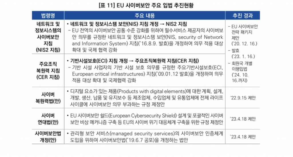 보고서는 EU가 사이버보안 분야에서도 단일시장을 위한 자체적인 사이버보안 입법 및 표준 정립, 인증 프레임워크 개발, 국제협력 확대 등을 추진하는 것이 각국의 사이버보안 정책 논의에 영향을 줄 것이라고 전망했다. 그러면서 EU 시장과 거래하는 외국 기업도 영향을 받을 수 있다고 예측했다.