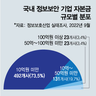 2021년 기준 국내 669개 정보보안 기업 중 업력이 18년 이상이 되는 기업의 비중은 50.8%에 이를 정도로 사이버보안 업종은 오래 존속해왔지만 전체 669개사 중 73.5%가 자본금 10억원 미만일 정도로 영세하다. 2021년 한 해 이들 669개사의 평균 연매출은 68억원 수준으로 같은 해 코스피 상장사 연 매출 평균치(3조2249억원), 코스닥 상장사 매출 평균치(1762억원)에 크게 못 미친다.