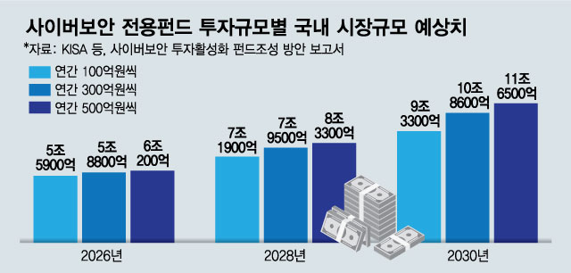 자금규모는 상대적으로 적지만 정책의지가 반영돼 조성되는 펀드라는 점에서 그 효과는 작지 않다는 게 업계의 평가다. 지난해 12월 KISA(한국인터넷진흥원) 의뢰로 ENF어드바이저가 작성한 '국내 사이버보안 산업 활성화를 위한 펀드 조성방안' 보고서에 따르면 2021년 기준 한국의 사이버보안 시장의 규모는 35억달러(약 4조6300억원)로 세계 1위인 미국(132억달러) 중국(99억달러) 영국(86억달러) 일본(71억달러) 독일(66억달러) 등에 비해 극히 미미한 상황이다. 하지만 연간 300억원 가량이 투자되는 사이버보안 펀드가 조성·운용될 경우 2030년 국내 사이버보안 시장의 규모는 10조8600억원으로 커지고 세계 4위 시장인 일본도 추월할 수 있을 것으로 전망했다.