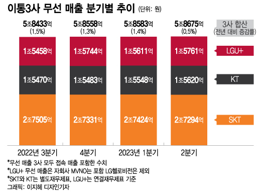 1일 업계에 따르면 중간요금제를 출시한 지난해 8월부터 통신 3사의 분기별 무선 매출(접속매출 포함)은 전년 대비 꾸준한 증가세다. 중간요금제가 출시된 지난해 3분기는 그 효과가 제한적으로 반영됐다 하더라도, 올해 2분기까지도 무선 매출은 계속 증가추세다.