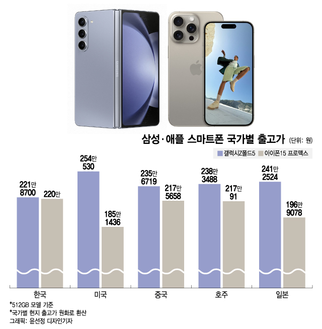반면 삼성 폰은 한국에서 가장 저렴하다. 지난달 출시한 갤럭시Z플립5·폴드5는 한국이 미국, 영국, 프랑스 등 주요 국가보다 최소 6만원에서 최대 100만원 저렴했다.