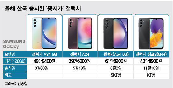 삼성전자에 따르면, 올해 국내에는 갤럭시 A24, A34 5G, 퀀텀4(A54 5G의 SKT향 단말기), 등이 출시됐다. 이미 선보인 3개의 A시리즈에 점프3와 S23 FE까지 더하면, 삼성전자는 정부가 원한 중저가폰을 올해 총 5대 국내에 선보이는 셈이다. 삼성전자 측은 "중저가 라인업을 매년 꾸준히 출시해 왔고, 내년에도 비슷한 수준일 것"이라고 강조하는 이유다.