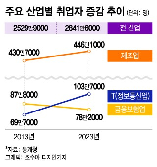 1일 통계청에 따르면 지난해 말 기준 IT산업 취업자는 103만7000명을 기록했다. 현재와 같은 산업분류를 적용한 2013년 이래 처음이다. 2013년 69만7000명이던 IT 취업자는 10년 간 34만1000명(49%) 늘었다. 지난해 제조업 취업자는 446만1000명으로 2013년에 비해 15만4000명(4%) 늘어나는 데 그쳤다. 제조업의 성장 둔화에 따른 고용 절벽을 IT산업이 대폭 보완해준 셈이다. 금융보험업 취업자의 경우 2013년 87만8000명으로 IT보다 많았지만, 지난해 78만2000명으로 역성장하며 IT보다 적은 일자리를 만들어냈다.