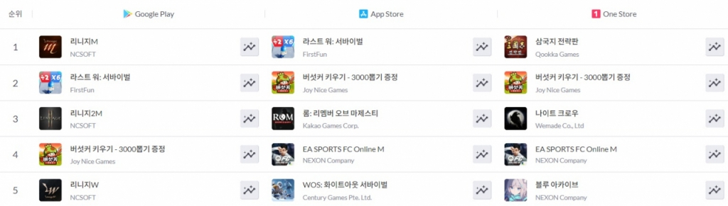 1일 모바일 빅데이터 플랫폼 '모바일인덱스'에 따르면 지난 2월28일 기준 국내 구글 '플레이스토어'와 애플 '앱스토어' '원스토어'의 매출 순위 상위 5개 중 MMORPG는 절반 이하다. 플레이스토어의 경우 여전히 리니지 3형제가 순위권을 지키고 있지만, 앱스토어와 원스토어에서 MMORPG는 단 하나에 불과했다. 이는 지난해 같은 기간과 비교해도 큰 변화다. 지난해 2월 앱마켓 매출 순위를 보면 플레이스토어의 경우 1~5위 모두 MMORPG가 차지했다. 앱스토어는 3개의 MMORPG가 순위권에 랭크됐다.