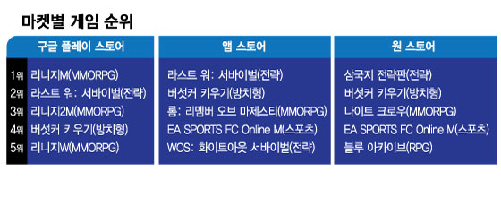 3일 모바일 빅데이터 플랫폼 '모바일인덱스'에 따르면 지난달 28일 기준 국내 구글 '플레이스토어'와 애플 '앱스토어' '원스토어'의 매출 순위 상위 5개 중 MMORPG는 절반 이하다. 플레이스토어에선 여전히 리니지 3형제가 순위권에 머물고 있지만, 앱스토어와 원스토어에서 MMORPG는 단 하나에 불과했다. 지난해 2월 플레이스토어에서 1~5위 모두가 MMORPG였고 앱스토어에서 3개의 MMORPG가 순위권에 랭크됐던 것과 차이가 크다.