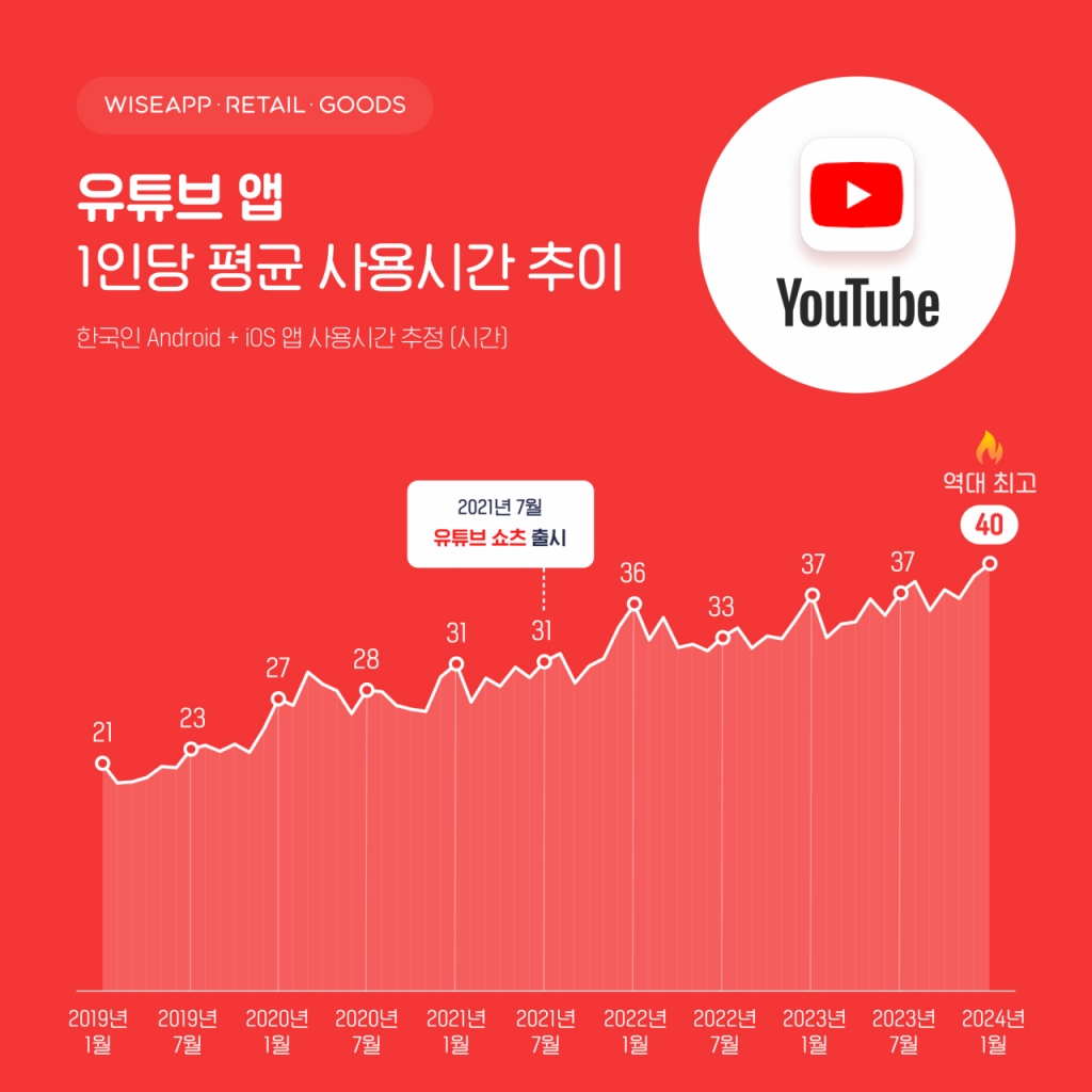 와이즈앱·리테일·굿즈(이하 와이즈앱)가 한국 스마트폰 사용자(압드로이드, iOS 합산)를 표본 조사한 결과, 지난 1월 유튜브 앱 1인당 평균 사용시간은 40시간을 넘어서며 역대 최대치를 기록했다. 2019년 1월(21시간) 대비 90% 늘었다.