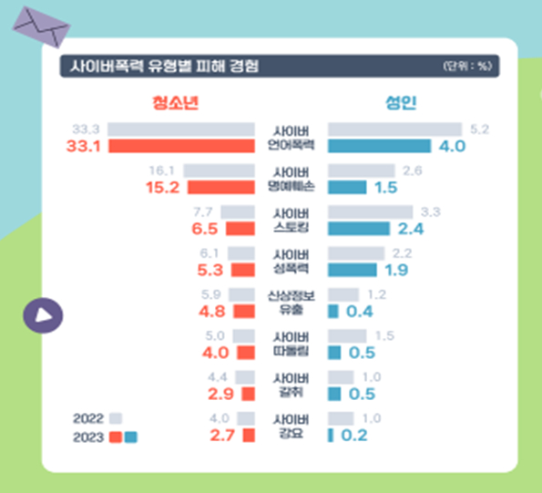 조사 결과에 따르면, 청소년 40.8%와 성인 8%가 사이버폭력(가해, 피해, 가해·피해 모두 포함)을 경험했다. 전년 대비 청소년의 경우 0.8%포인트(p), 성인은 1.6%p 감소한 수치다. 방통위는 코로나19 팬데믹 종식으로 온라인 활동이 줄면서 피해 경험률이 줄어들었다고 분석했다.