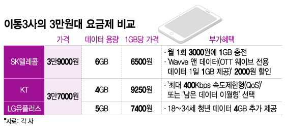 정부가 출시를 요청해 온 3만원대 요금제를 비교하면, SK텔레콤이 경쟁사들보다 2000원 비싸지만 데이터 제공량은 가장 많다. 1GB당 가격은 SK텔레콤은 6500원, LG유플러스는 7400원, KT는 9250원 순이다. 가격만 따지면 LG유플러스, 데이터를 고려하면 SK텔레콤이 비교 우위다.