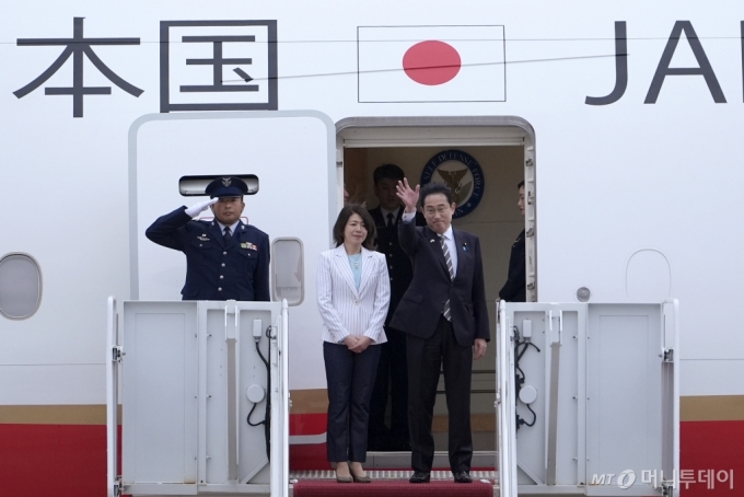![지난달 11일(현지시간) 미국 방문 일정을 마친 기시다 후미오 일본 총리와 부인 유코 여사가 미 메릴랜드주 앤드류스 합동기지에서 워싱턴 일정을 마치고 전용기에 오르며 인사하고 있다.- /사진=AP/뉴시스]](https://thumb.mt.co.kr/cdn-cgi/image/f=avif/21/2024/05/2024050516015856111_1.jpg)