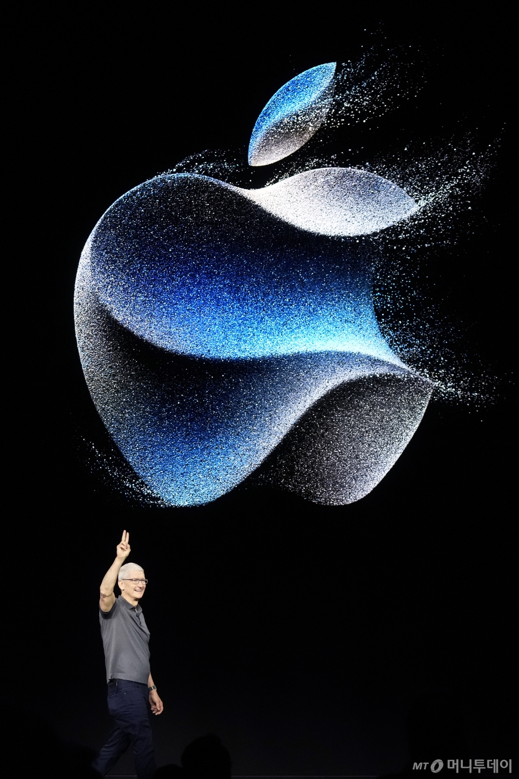 ![[쿠퍼티노=AP/뉴시스] 팀 쿡 애플 CEO가 12일(현지시각) 미 캘리포니아주 쿠퍼티노에 있는 애플파크에서 애플의 신제품 발표 행사 '원더러스트' 무대에 올라 인사하고 있다. 애플은 이날 최신 스마트폰인 아이폰15 시리즈 등 신제품을 공개했다. 2023.09.13. /사진=민경찬](https://thumb.mt.co.kr/cdn-cgi/image/f=avif/21/2024/06/2024060917523336989_1.jpg)