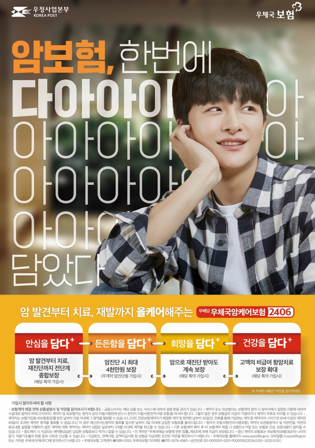 '(무)우체국암케어보험'은 암을 빈틈없이 보장하는 상품으로, 주계약의 암진단과 암사망 보장은 물론 특약을 통해 생존보장을 강화했다. 특약으로 신규 항암치료·로봇수술 등의 최신 치료를 보장받을 수 있다. 재진단암 보장에서 발병 후 재활치료와 간병비·생활비까지 보장 공백 없이 혜택을 받을 수 있다. 남자의 경우 77세, 여자의 경우 80세까지 최초 계약(실버형 기준)이 가능하다.