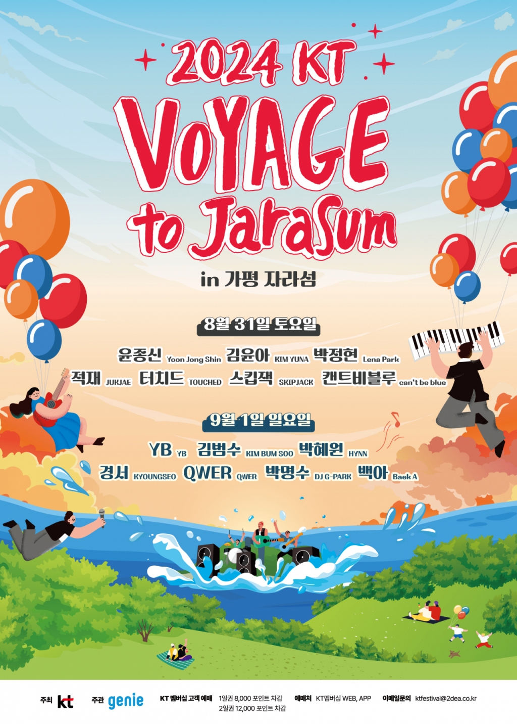 KT는 '2024 KT 보야지 투 자라섬'을 31일 경기 가평군 자라섬에서 개최한다고 11일 밝혔다. KT 고객이라면 누구나 12일부터 KT 멤버십 앱에서 예매할 수 있다.