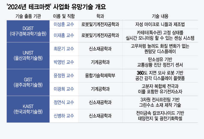 테크마켓에서는 4대 과학기술원이 보유한 특허 중 △고효율 수소생산 촉매 제작법 △신축성 있는 퀀텀닷 디스플레이 △탄소섬유 기반 정전기 센서와 같이 시장 수요가 높고 사업화 가능성이 큰 분야별 대표 기술 8개를 엄선, 해당 연구자가 개발 취지 및 핵심기능, 기존 기술과의 차별점, 응용 가능한 사업 분야 등을 직접 알기 쉽게 설명합니다. 또 사전 또는 현장에서 신청한 수요기업을 대상으로 연구자와의 일대일 상담·컨설팅도 진행합니다