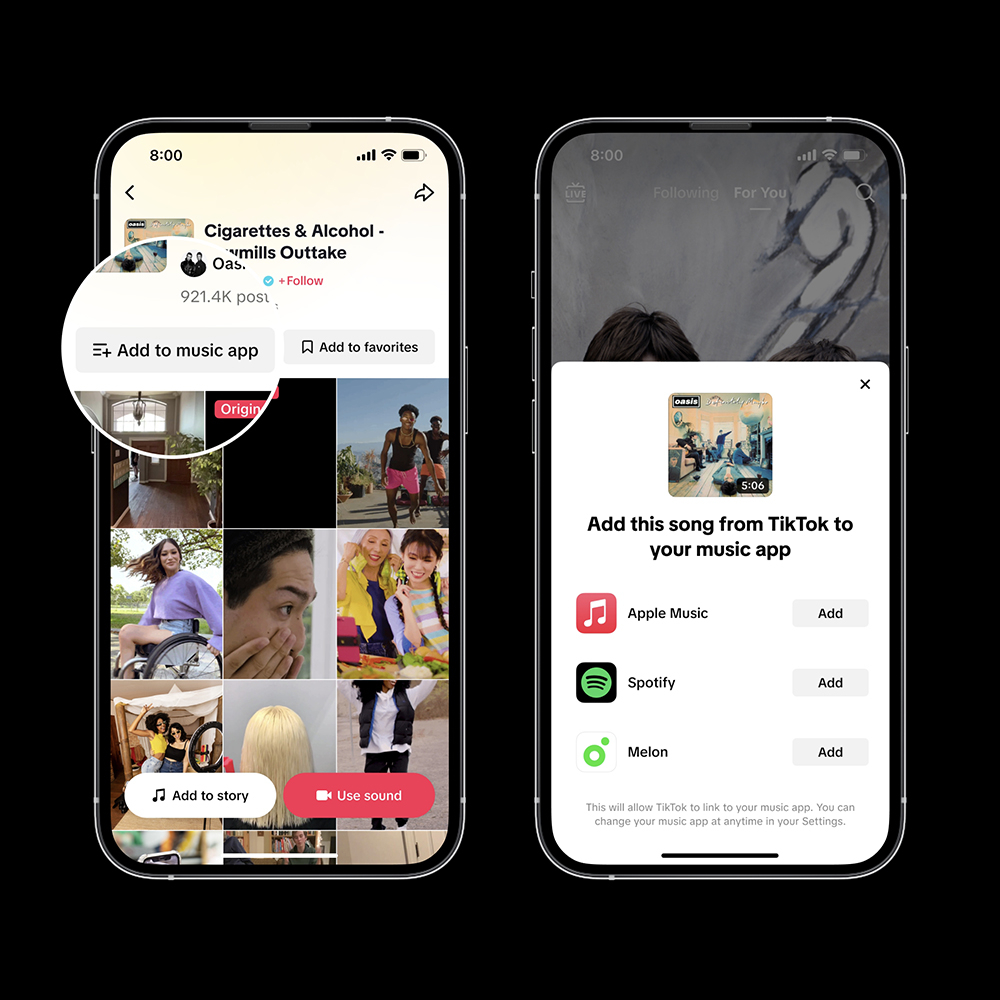 음악 앱에 추가는 이용자가 틱톡에서 발견한 노래를 원하는 뮤직 스트리밍 서비스에 저장할 수 있는 기능이다. 이날부터 전 세계의 이용자들은 틱톡에서 발견한 음악을 기존 파트너들 외에 새롭게 추가된 멜론에서도 저장할 수 있다.