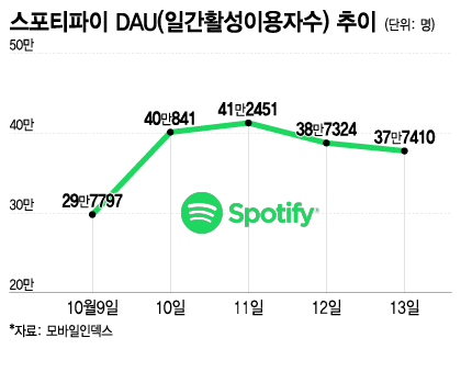 무료 서비스 론칭에 스포티파이 신규 설치 건수도 급증했다. 지난 10일 스포티파이 신규 설치 건수는 4만9816건으로 전날(3709건)과 비교해 13배 이상 늘었다. 평균 일일 신규 설치 건수가 4000건 안팎이었던 것을 고려하면 큰 증가 폭이다. 이후 11일에도 4만4915건 등을 기록하며 높은 설치 건수를 보였다.