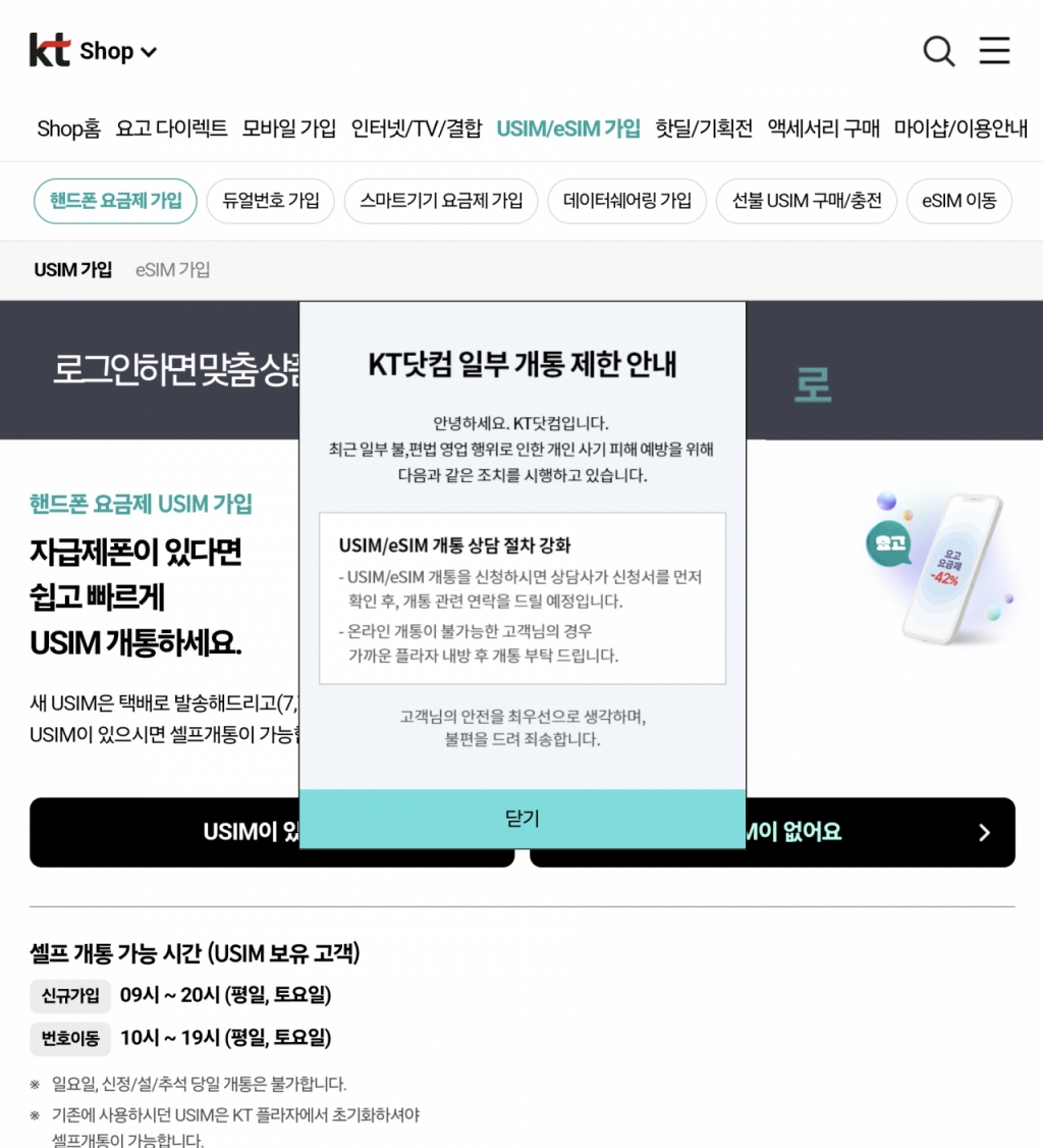 7일 통신업계에 따르면 KT는 최근 자사 공식 온라인샵 'KT닷컴'에 "KT닷컴에서의 일부 개통을 제한한다"며 "일부 불·편법 영업 행위로 인한 개인 사기 피해 예방을 위해 유심·e심 개통 상담 절차를 강화한다"고 밝혔다.