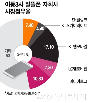 과학기술정보통신부에 따르면 지난해 6월 이통3사 자회사의 알뜰폰 시장점유율은 47%다. △SK텔링크 7.4% △KT엠모바일 17.1% △KT스카이라이프 4.4% △LG헬로비전 7.3% △미디어로그 10.8%다. 여기에 국민은행 계열사 KB리브모바일, 삼성 계열의 에스원(86,600원 ▲700 +0.81%)안심모바일 등을 더하면 점유율은 51.8%까지 늘어난다. 우리은행도 알뜰폰 시장 진출을 타진하고 있어 약 8개 사업자가 남은 8.2% 점유율을 두고 경쟁해야 하는 상황이다.