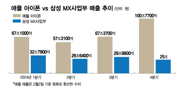 아이폰 매출은 삼성전자 전체 실적보다 높다. 삼성은 지난해 4분기 전년 동기 대비 12.0% 증가한 75조8000억원의 매출을 기록했다. 같은 기간 삼성 모바일 사업을 담당하는 MX(모바일경험)사업부 매출은 25조원인데, 아이폰 매출의 4분의 1 수준에 불과하다. MX사업부 매출에는 스마트폰을 비롯해 태블릿, 스마트워치 등의 수익이 포함돼 있다.