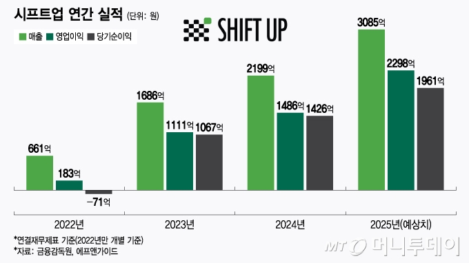 업계는 매출액이 올해 더 레벨업할 것으로 본다. 에프앤가이드 컨센서스(전망치 평균)에 따르면 증권사들은 올해 시프트업의 매출액을 지난해보다 40% 증가한 3085억원, 영업이익은 55% 늘어난 2298억원으로 예상한다. 영업이익률은 74%에 달할 것으로 기대된다. 정호윤 한국투자증권 연구원은 "올해는 니케 중국과 스텔라블레이드 PC 등 성장모멘텀(동력)이 풍부한 해"라고 내다봤다.