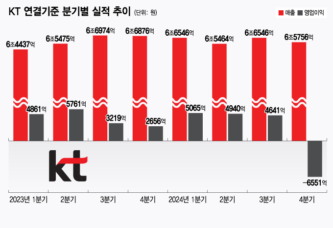 KT(59,400원 ▼2,000 -3.26%)가 지난해 역대 최대 매출에도 대규모 구조조정에 따른 일회성 비용 발생으로 부진한 영업이익을 냈다. 지난해 4분기는 10년여 만에 분기 적자를 기록했다. 다만 올해는 인건비 감소 등의 효과가 본격 반영되면서 연간 영업이익은 전년 대비 3배가량 증가할 전망이다.