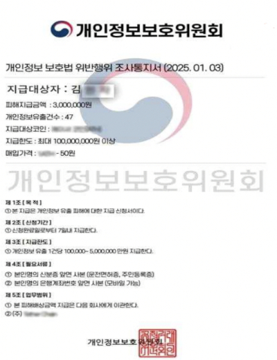 개인정보위는 "위탁업체를 통한 보상을 실시하거나 가상자산을 지급하지 않고, 개인정보나 현금도 절대 요구하지 않는다"고 했다. 이어 "'개인정보보호법 위반행위 조사통지서' 형식의 공문도 발행하지 않으니 이 같은 공문을 수신한 경우 사기 피해에 주의하라"고 밝혔다.