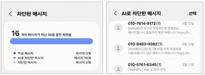 삼성 갤럭시 스마트폰에선 AI가 악성 스팸번호로 판단되는 발신번호와 위험링크(URL)가 포함된 불법 스팸문자를 '차단함'으로 자동분류한다. 사용자는 이 중 수신이 필요한 경우 선택적으로 차단을 해제하거나 확인할 수 있다.