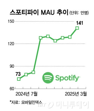 다만 이들의 재도약이 순탄치는 않아 보인다. 스포티파이가 지난해 10월 광고를 들으면 음원을 무료로 제공하는 '스포티파이 프리' 요금제를 출시한 뒤 빠르게 성장하고 있기 때문이다. 모바일 인덱스에 따르면 스포티파이의 3월 MAU(월간활성이용자수)는 141만명으로 2월(129만명)에 비해 약 10%(12만명) 증가했다. 스포티파이 프리가 출시되기 전인 9월(82만)과 비교하면 1.71배 많다.