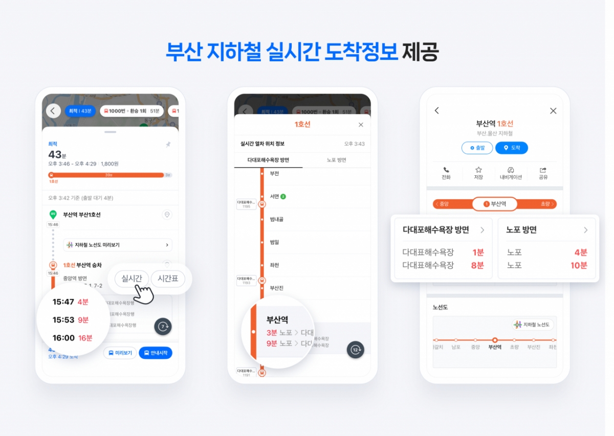 네이버(NAVER(211,000원 ▲9,500 +4.71%))는 지난 7일부터 네이버 지도에서 부산도시철도 1~4호선의 실시간 도착 정보와 열차 위치 정보를 제공하고 있다고 8일 밝혔다. 그동안 서울·경기·인천 등 수도권 지하철에 한해 제공되던 실시간 지하철 정보 서비스가 부산 지역으로 확대된 것이다.