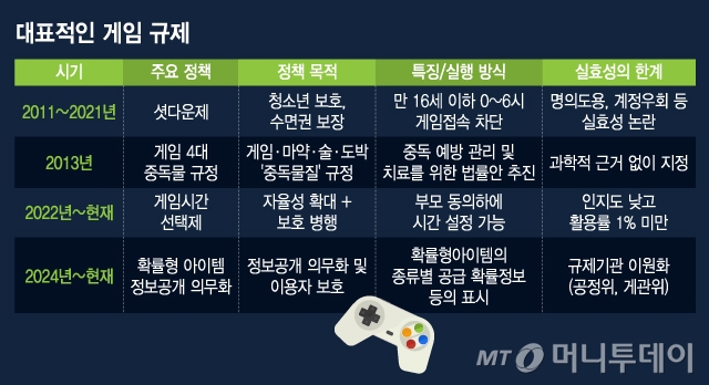 규제영역에서도 2011년 청소년의 수면권을 보장한다는 명목으로 '셧다운제'를 도입했으나 계정 우회 등 회피전략을 유발해 실효성 논란이 일었다. 결국 셧다운제는 2021년 폐기됐다.