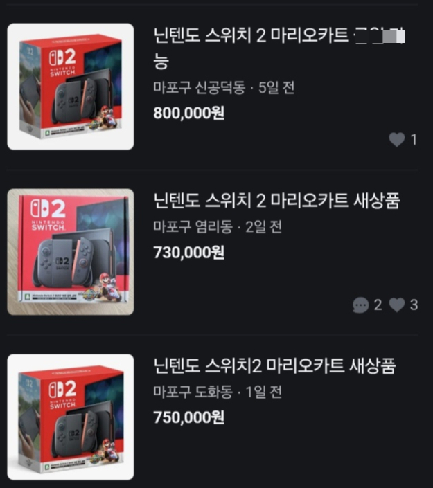 중고거래 사이트에서는 닌텐도 스위치2 단품은 68만~70만원, 마리오 카트 월드 포함은 최대 80만원 선까지 판매되고 있다. 기본적으로 5만~10만원가량 웃돈이 붙었다.