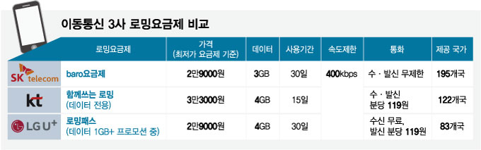 SK텔레콤(80,900원 ▲3,100 +3.98%)은 자동로밍 이용시 하루 데이터요금을 5000원으로 제한한다. 상한에 도달하면 200kbps(초당 킬로바이트)로 무제한 이용할 수 있다. KT(59,500원 ▲100 +0.17%)는 하루 1만1000원에 200kbps로 속도를 제한하며 LG유플러스(15,330원 ▼170 -1.1%)는 5500원 요금에 400kbps 속도제한을 적용한다.