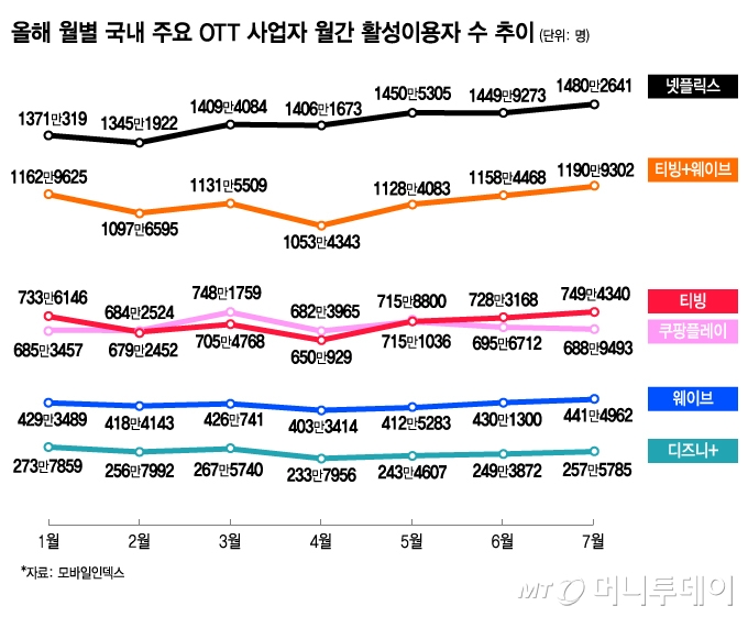 티빙·웨이브의 7월 MAU를 더하면 1190만9302명에 달한다. 이는 넷플릭스의 7월 MAU(1480만2641명)에 비해 숫자는 적지만 지난 4월 대비 3개월새 증가율은 13.05%로 넷플릭스의 같은 기간 MAU 증가율을 크게 웃돈다.