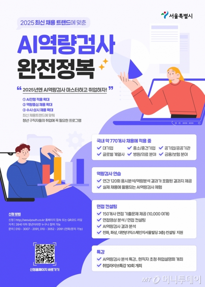 9일 서울시에 따르면 39세 이하 서울 거주 청년은 AI 면접체험(성향검사, 영상면접, 전략게임)과 역량 검사 프로그램을 무료로 이용할 수 있다. 청년층 고용 한파와 AI 활용 취업 트렌드 등의 변화에 맞춰 서울시가 '취업 사다리' 역할을 하자는 취지에서 2021년부터 도입한 프로그램이다.