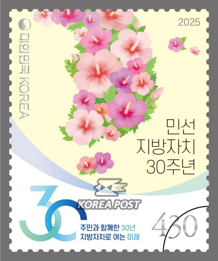 과학기술정보통신부 우정사업본부는 오는 17일 민선 지방자치 출범 30주년 기념 우표 1종을 발행한다고 13일 밝혔다. 기념 우표는 우리나라 국화인 무궁화를 한반도 지도에 수놓아 '민주주의가 꽃피는 대한민국'을 표현했으며 총 45만장 발행된다.