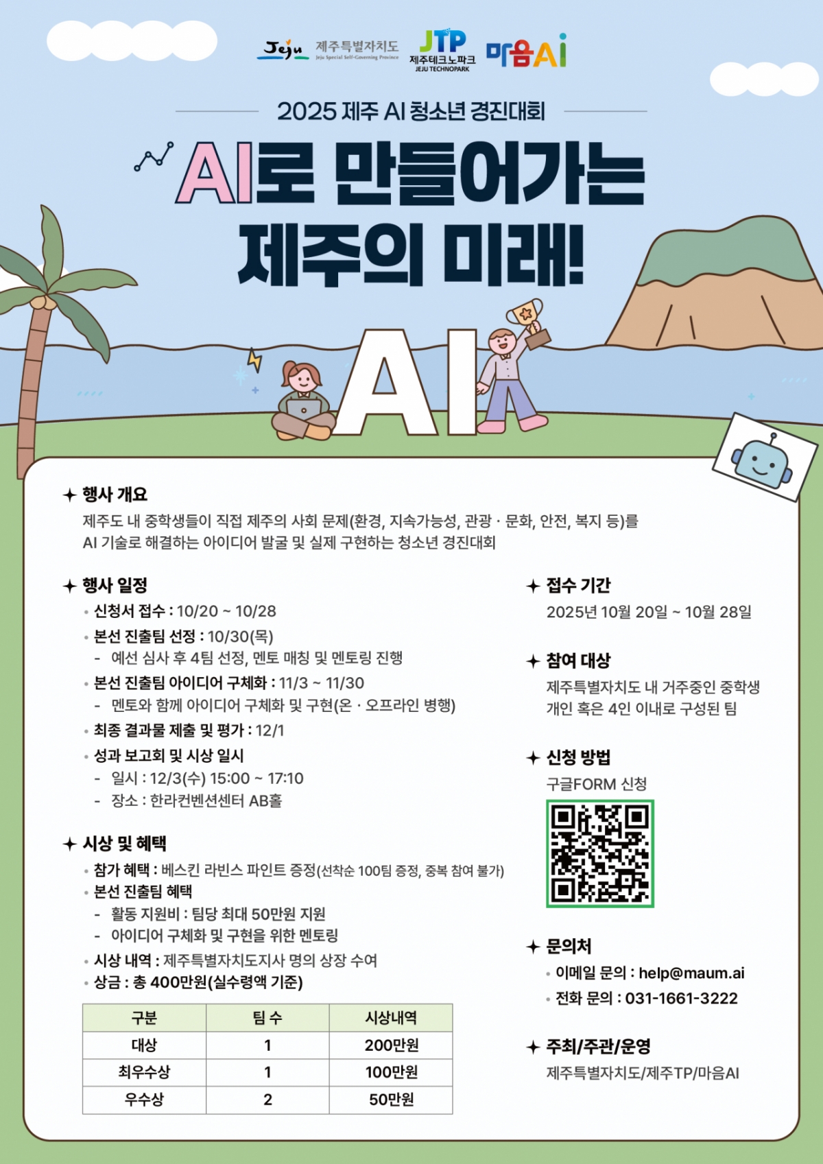 이번 콘퍼런스에서는 제주 지역 중학생들이 직접 AI를 활용해 지역 문제를 해결하는 '2025 제주 AI 청소년 경진대회'도 진행된다. 참가 학생들은 생성형 AI 및 에이전트·피지컬·어드밴스 AI 등 첨단 기술을 활용해 지역 사회 문제해결에 실질적 기여가 가능한 서비스 기획 및 데모 프로그램(시제품)을 구현할 예정이다.