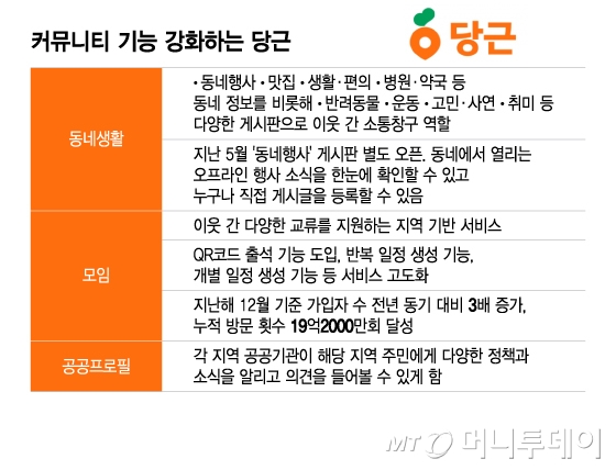 당근은 동네생활 탭 중 모임 서비스를 특히 강화하고 있다. QR코드 출석 기능을 도입했고 정기모임 관리를 위한 '반복 일정 생성 기능', 모임 일정에 참여한 이웃만 체크해 채팅방을 열고 관리할 수 있는 '개별 일정 생성 기능' 등을 도입해 서비스를 고도화했다. 지난해 12월 기준 모임 가입자 수는 전년 동기 대비 3배 증가했으며 누적 방문 횟수는 19억2000만회를 달성했다.