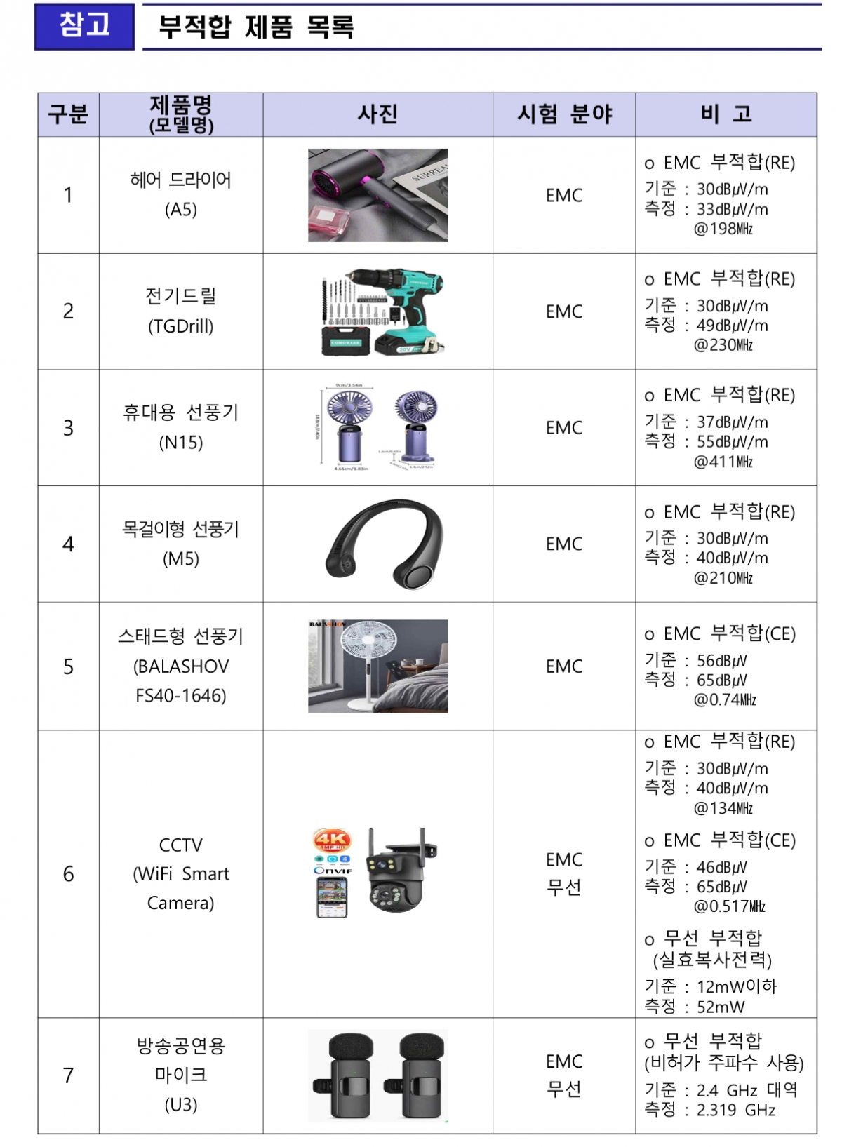 이 중 A5 헤어 드라이어와 TG드릴의 전기 드릴, N15의 휴대용 선풍기, M5의 목걸이형 선풍기, 발라쇼브(BALASHOV)의 스탠드형 선풍기 및 CCTV(폐쇄회로TV), U3 방송공연용 마이크 등 7개 제품이 전파 기준을 위반한 것으로 조사됐다. 이들은 현행 기준이 정한 전파 기준을 맞추지 못하거나 비허가 주파수 대역을 이용하는 등 문제가 있었다. 다만 인체 위해성 여부를 판별하는 기준인 인체보호기준을 위반한 제품은 없었던 것으로 나타났다.