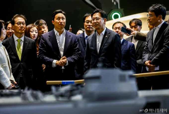 ![[성남=뉴시스] 정병혁 기자 = 배경훈 부총리 겸 과학기술정보통신부 장관과 정기선 HD현대 회장이 20일 경기 성남시 HD현대글로벌R&D센터에서 열린 HD현대-UNIST 등 조선-해양 산업AI MOU 체결식에 앞서 퓨처-X, 잠수함, 항공모함 등 전시물을 살펴보고 있다. 2025.11.20. /사진=정병혁](https://thumb.mt.co.kr/cdn-cgi/image/f=avif/21/2025/11/2025112317171791508_1.jpg)