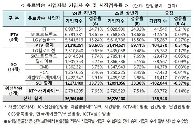 방송미디어통신위원회는 24일 '2025년도 상반기 유료방송 가입자 수 및 시장점유율'을 발표하고, IPTV(인터넷TV), SO(종합유선방송), 위성방송 등 각 플랫폼별 가입자 수를 공개했다. 해당 수치는 KAIT(한국정보통신진흥협회)의 실태조사 결과를 바탕으로 민간 전문가 심의회를 거쳐 확정됐다.