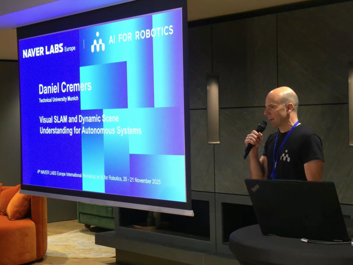 마틴 휴멘버거 네이버랩스 유럽 연구소장은 네이버랩스의 공간지능 연구 방향을 소개하며 새로운 파운데이션 모델 개발과 기존 모델의 개선·통합을 통해 비전문가도 실제 환경에서 손쉽게 활용할 수 있는 공간지능 기반을 구축해 나가고 있다고 설명했다.