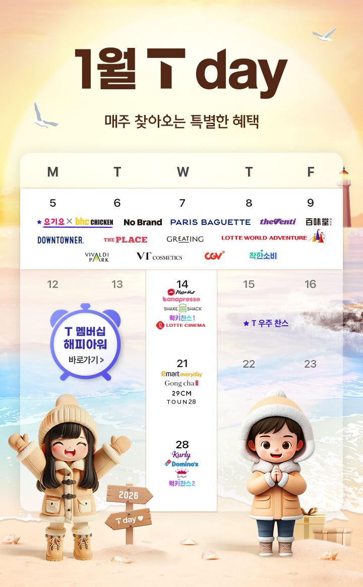 겨울 시즌을 맞아 가족 고객을 위한 나들이·레저 혜택도 준비됐다. T멤버십 회원은 1월 5일부터 9일까지 할인 쿠폰을 다운로드하면 롯데월드 어드벤처 서울·부산(1월 18일까지)과 비발디파크(1월 31일까지)에서 할인 혜택을 받을 수 있다. 롯데월드 어드벤처 서울에서는 종합이용권을 본인은 50%, 동반 3인까지는 30% 할인된 가격으로 이용할 수 있다. 롯데월드 어드벤처 부산에서는 종합이용권을 본인은 55%, 동반 3인까지는 30% 할인된 가격으로 구매할 수 있다.