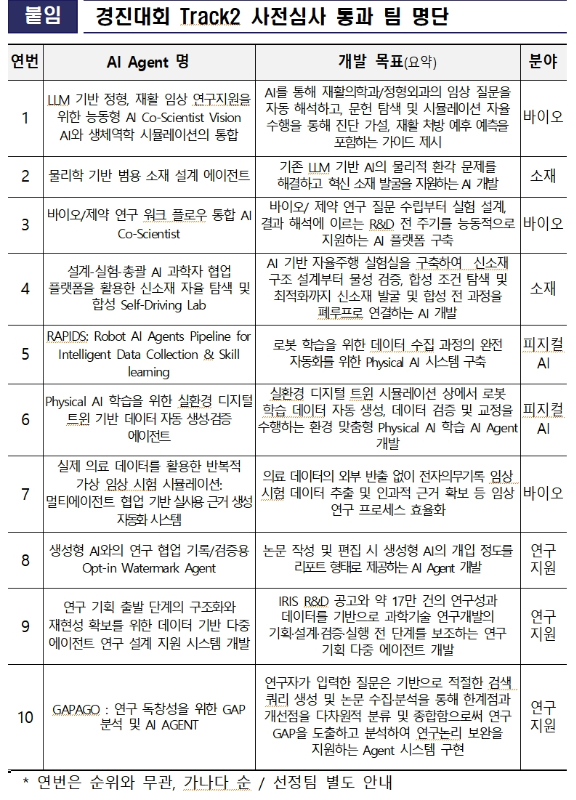 10개팀은 △바이오 부문 3개팀(LLM 기반 정형·재활 임상 연구지원을 위한 능동형 AI 코사이언티스트 비전 AI와 생체역학 시뮬레이션의 통합, 바이오·제약 연구 워크 플로우 통합 AI 코사이언티스트, 멀티에이전트 협업 기반 실사용 근거 생성 자동화 시스템) △소재 부문 2개팀(물리학 기반 범용 소재 설계 에이전트, 설계-실험-총괄 AI 과학자 협업 플랫폼을 활용한 신소재 자율 탐색 및 합성 셀프 드라이빙랩) △피지컬AI 부문 2개팀(RAPIDS: Robot AI Agents Pipeline for Intelligent Data Collection & Skill learning, 피지컬 AI 학습을 위한 실환경 디지털 트윈 기반 데이터 자동 생성·검증 에이전트) △연구지원 부문 3개팀(생성형 AI와의 연구 협업 기록·검증용 옵트인 워터마크 에이전트, 연구 기획 출발 단계의 구조화와 재현성 확보를 위한 데이터 기반 다중 에이전트 연구 설계 지원 시스템 개발, GAPAGO : 연구 독창성을 위한 갭 분석 및 AI 에이전트)이다.