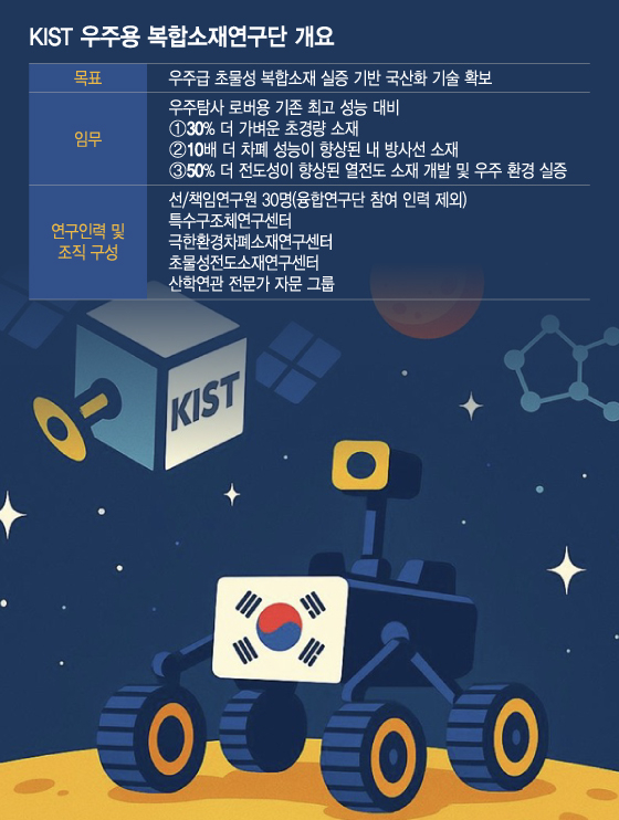 이어 "우주용 소재는 단순히 가볍고 강한 것을 넘어 방사선과 진공 환경, 극저온과 고온을 오가는 열적 충격, 미세 입자 충돌까지 견뎌야 하는 극한 조건을 충족해야 한다"며 "달 탐사 로버와 같은 우주 모빌리티를 기준으로 기존 대비 30% 더 가벼운 초경량 소재, 방사선 차폐 성능을 10배 이상 뛰어난 차폐 소재, 50% 이상 전도성을 높인 열전도 소재 개발을 목표로 하고 있다"고 설명했다.