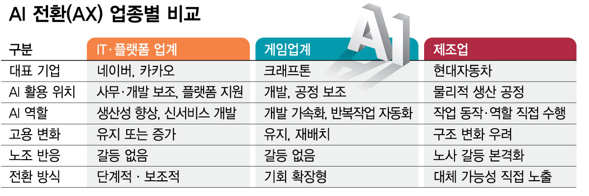AI 전환(AX)을 맞이한 업계별 온도차가 상당하다. AI 도입에 앞장선 네이버(NAVER(223,000원 ▲1,000 +0.45%))·카카오(50,600원 ▲200 +0.4%) 등 IT(정보기술) 업계와 게임업계에서는 AX가 고용 충격 없이 진행중이다. 반면 현대자동차(현대차(517,000원 ▼4,000 -0.77%))에서는 휴머노이드 로봇 '아틀라스' 도입을 둘러싼 노사 갈등이 본격화됐다.