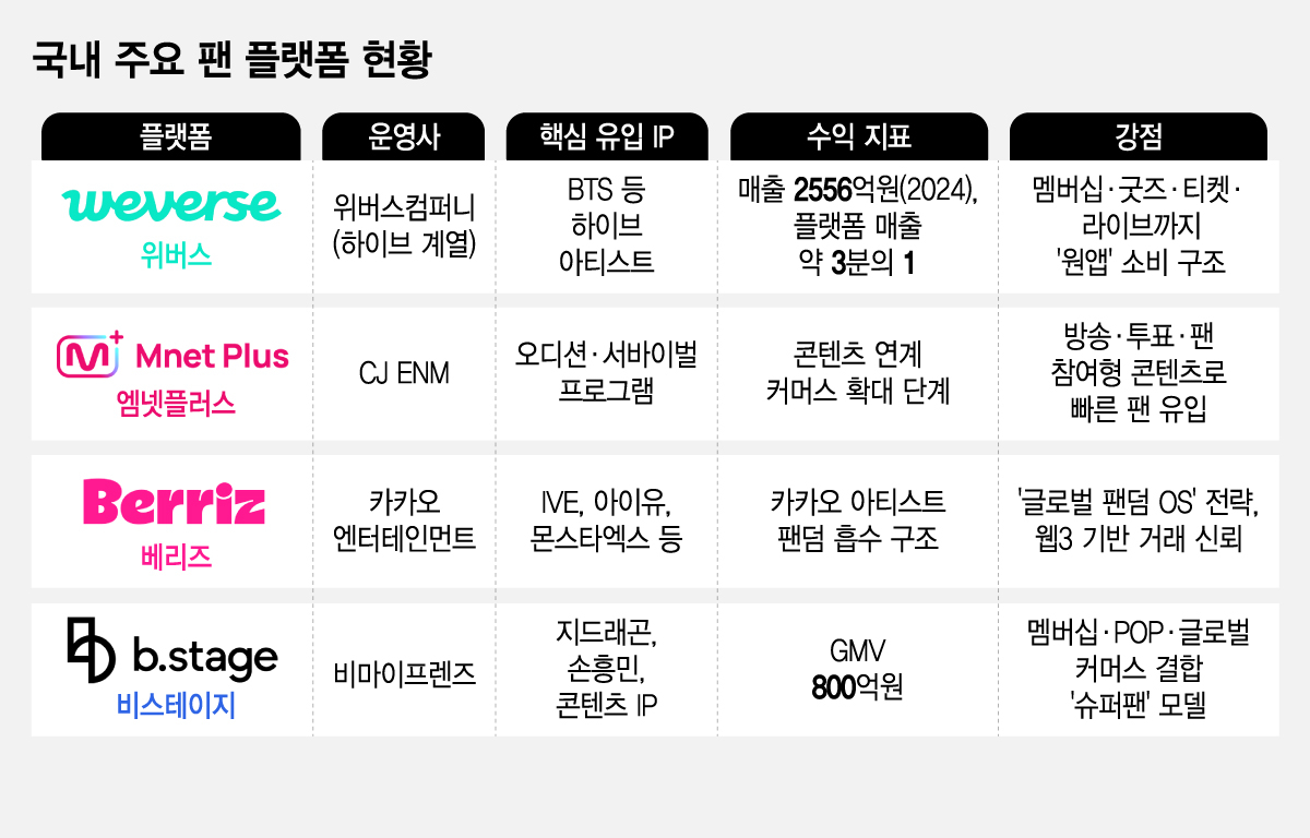 팬 플랫폼이 달라졌다. 팬들이 모여 아티스트에 대한 이야기를 나누던 곳인데, 지금은 돈이 모이는 공간이 됐다. 굿즈 구매, 멤버십 가입, 콘서트 티켓 예매가 모두 한 앱 안에서 끝난다. 팬이 오래 머물수록 더 많이 쓰는 구조다. 국내 주요 엔터테인먼트 회사들이 이 시장에 뛰어드는 이유다.