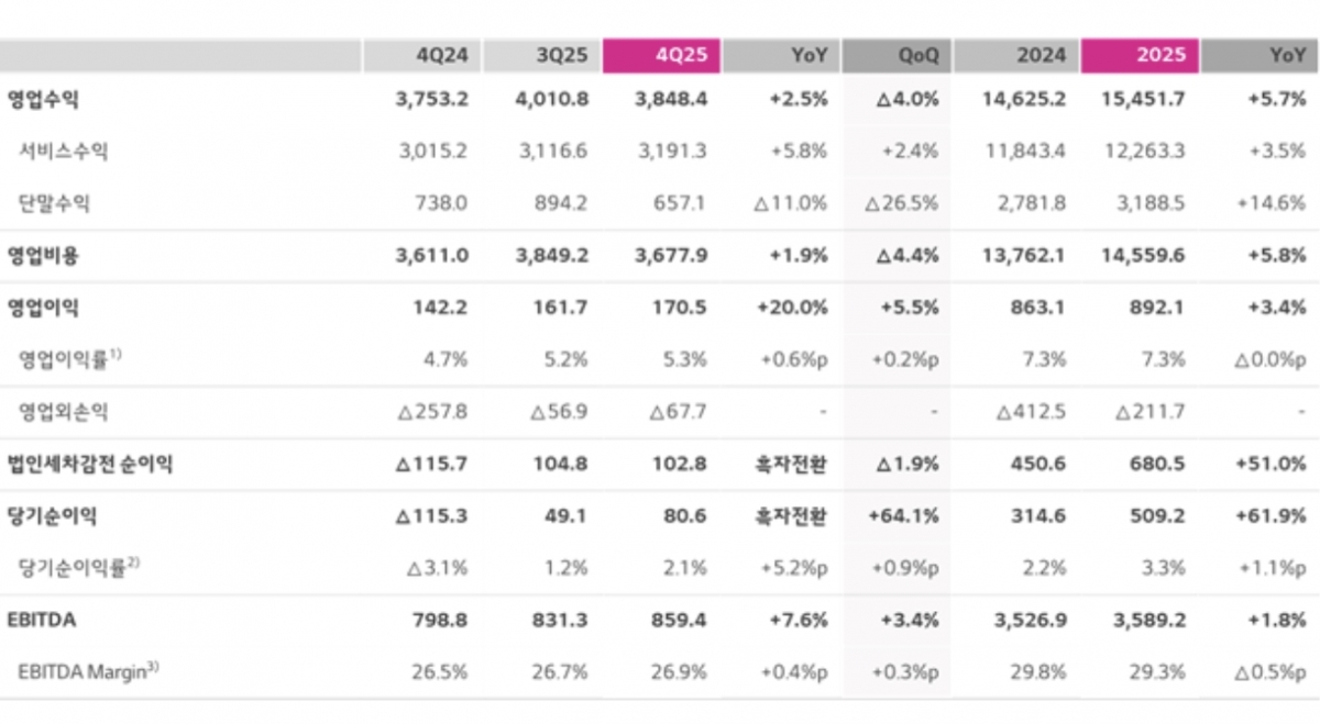 영업수익에서 단말수익을 제외한 매출인 서비스수익은 12조 2633억원으로 3.5% 증가했다. 서비스수익은 2025년 경영 가이던스인 '연결기준 서비스수익 2% 성장'을 상회했을 뿐만 아니라, 최근 4년내 최고 성장률을 기록했다.